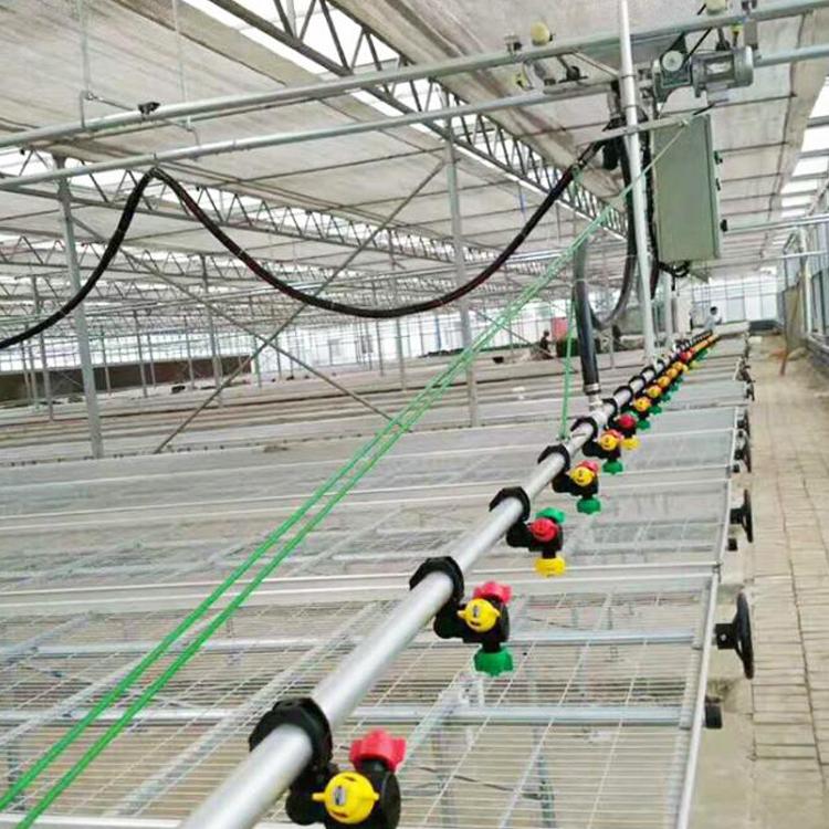 可以選擇使用噴灌機(jī)轉(zhuǎn)移系統(tǒng),噴灌機(jī)可以越跨進(jìn)行灌溉工作,從而用一臺噴灌機(jī)完成多跨溫室的灌溉任務(wù),以節(jié)約投資。